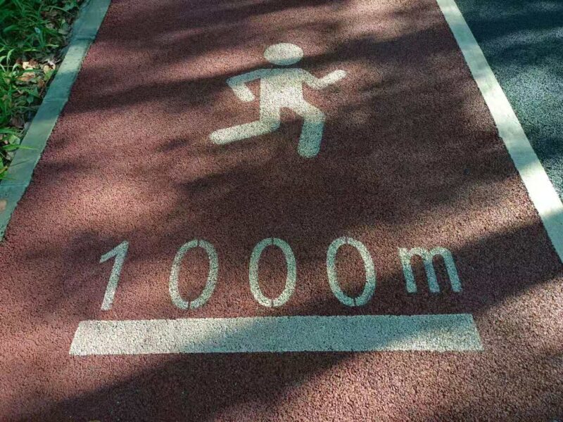 この赤い舗装側には、スタート地点となる北端からの距離が記され、ジョギングなどをされる方の目安となる。
