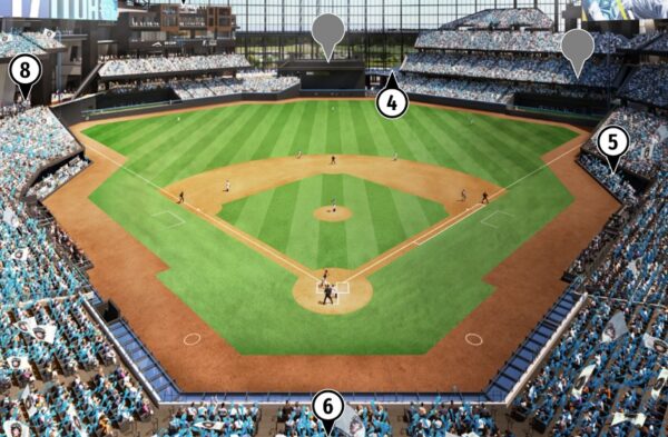この新球場の完成図を見ると、両翼のみ100mでセンター方向の距離は公表されていないが、右中間・左中間の膨らみがなく直線で、東京ドームに似たようなグラウンド形状となっている。
