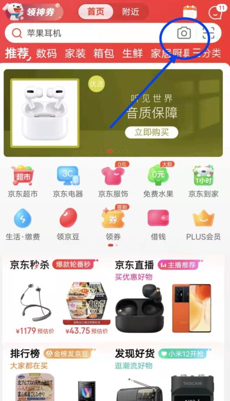 京東アプリの検索窓のカメラマークをクリックする。