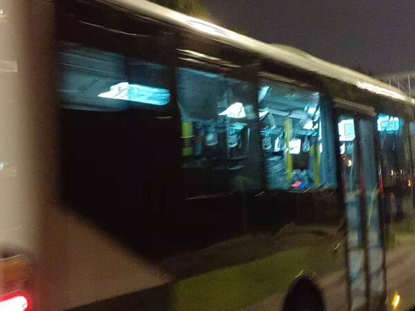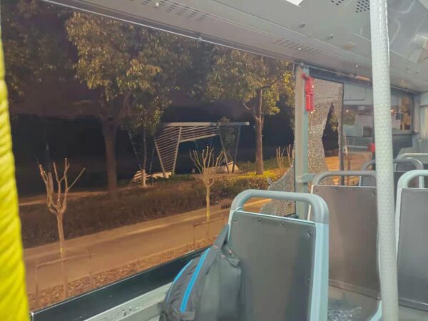 窓ガラスが割れてしまったのでバスは一旦停止したが、窓ガラスのガラス粒は大方バスの外側の道路へ落ちてしまったので、ガラス破片を掃除することもなく、そのままゆっくり走り出した。