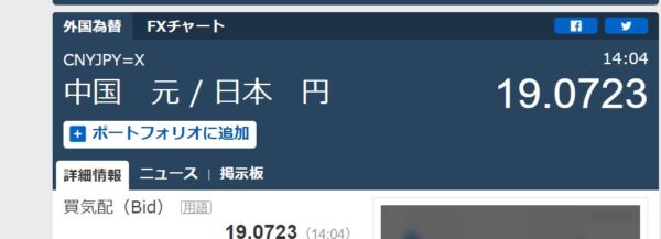 1米ドル150円だった時は確か1元が20円を少し超えていたと思うが、現時点で1米ドルが130円を切り120円台後半になった現在でも、1人民元はまだ19円台のままなのである。