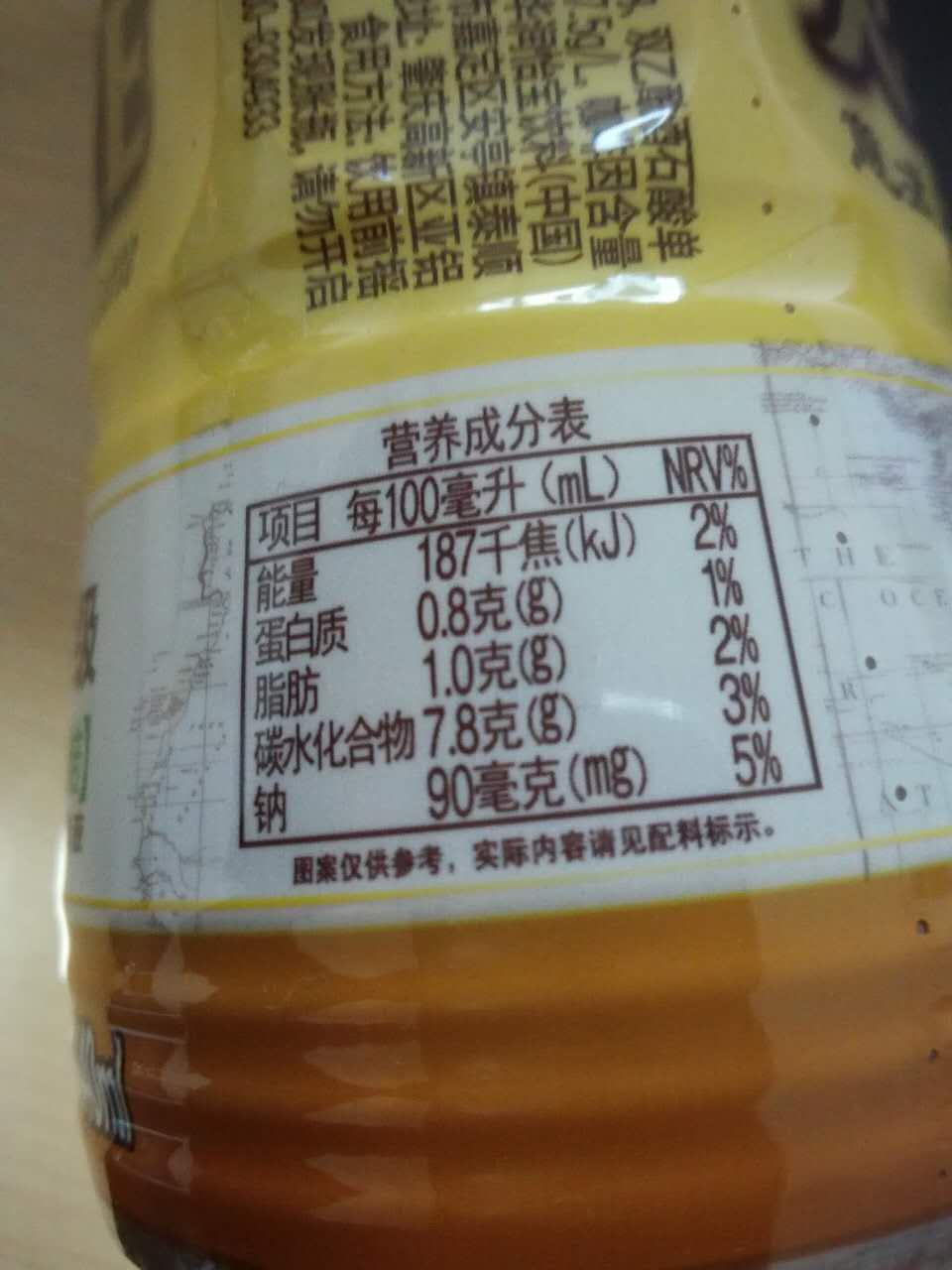 同様に下記は日系のキリンのファイアーというミルクコーヒーの表示だが、これをやはり日本風に総量計算すると187kj、440mlなので