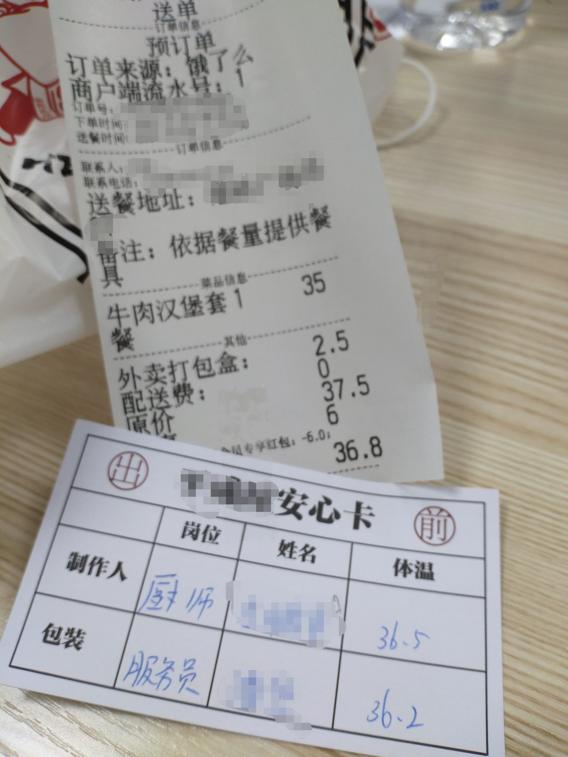 さらにお店の側でも担当者がコロナに感染していないという証明というか、安心のために調理人と梱包する人の担当者の名前と体温が記されたメモが添付されているのである。