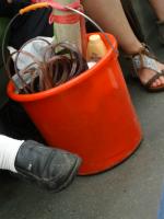 清掃用の水バケツだけでなく、塗料や洗剤用の使用済み容器もよくカバン代わりにして街の人たちは物を運んでいる。
