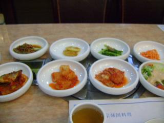 、まず先に出てきたミッパンチャン(副菜)の量がこのお店は多く驚いた。9皿もあった。どうもこのミッパンチャンの数は店のグレードに比例している気がする。このお店はどれも美味しいし、無茶苦茶辛い唐辛子系が存在しなかったのもうれしい。