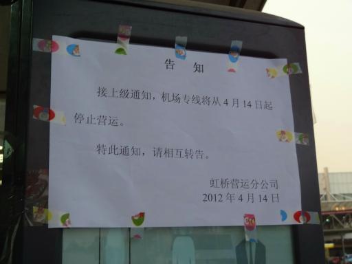 まあ、確認のためわざわざ行ったわけではないのだが、虹橋空港方面に用があったたのでちょっと寄ってみたところ、やはりバス停に張り紙がしてあり、どうやら本当になくなってしまったようだ。