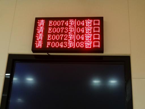 ところでこの順番待ちの際に気が付いたのだが、中国の銀行も日本と同じように番号札を渡され、電光掲示板の表示に従って窓口に行くシステムになっており、この方法はかなり以前からどこでも採用されていて珍しい物ではなくなっていたのだが、最近では呼出し番号が目的別に分類され、アルファベットの頭文字が付くようになっていた。