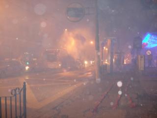 また花火が出す煙で辺りがぼやけ視界がどんどん悪くなり、こちらの呼吸も苦しくなります。地球の終わり宇宙の始まりかという勢いで、油断をすると意識を失ってしまいそうです。さらに凄いことに、この状況にも関わらず打ち上げの花火から1mも離れていないところをバスやタクシーがすり抜けます。昔の西部警察か特撮映画のようです。