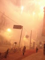 戦争のニュース報道以外でこんな光景を見る事はありません。しかもものすごい接近していますので、花火の華は頭の上に覆いかぶさるように広がります。同時に打ち上げの紙くずもいっぱい飛んできます。ビルの谷間の轟音で物音がほとんど聞こえない状態になりました。これでもかこれでもかとどんどん打ちあがります。そして追い討ちをかけるように先ほど準備してあった爆竹が破裂し始めました。
